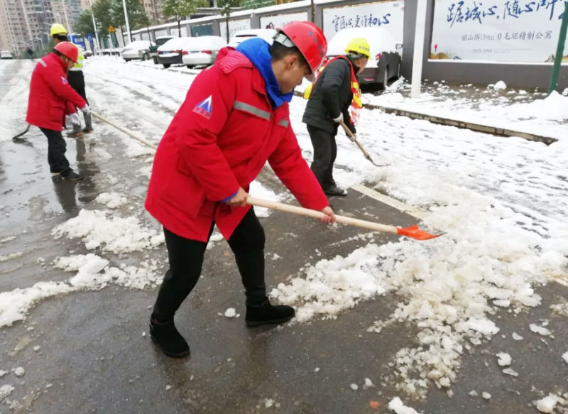 有想法就付諸于行動,簡短交流后,員工們開始有效的分工安排,開裝載機、拿鐵鍬、用掃帚、撒工業(yè)鹽、保障物資等,默契合作。